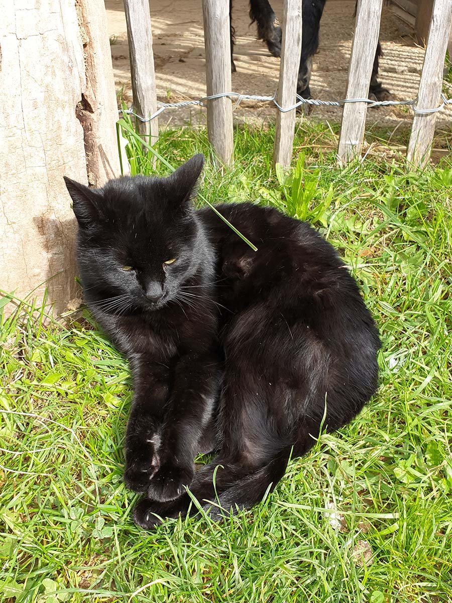 Am Tierlacherhof hat die Katze Mimi ihr Reich. Obwohl sie eine eher kleine Katze ist, ist sie doch eine exzellente Jägerin und hilft uns so den Hof mäusefrei zu halten. In Bezug auf Menschen ist aber Kuschelkurs angesagt. Ihr samtig weiches schwarzes Fell lädt zum Streicheln ein. Auch die Lamas und Alpakas finden Mimi sehr interessant und versuchen immer wieder sie zu beschnuppern. Glücklicherweise ist Mimi auf einem anderen Lamahof zur Welt gekommen und hat überhaupt keine Scheu vor den großen Cameliden. Wahrscheinlich deswegen teilen sie sich auch mit ihr die Wassertränke.