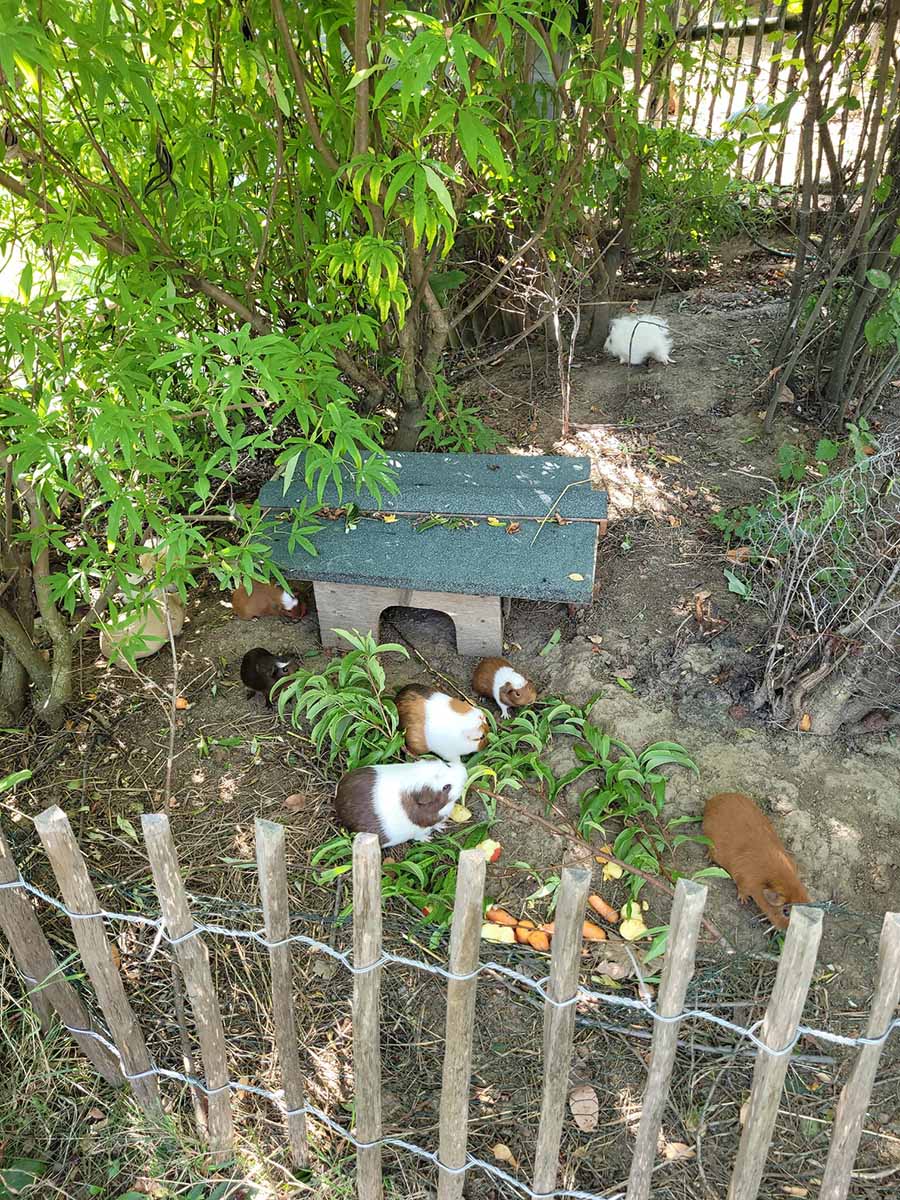 Schon wenn man sich ihrem Häuschen nähert, melden sie sich lautstark: Ein fröhliches Quieken, gespitzte Ohren – und im Nu flitzen sie neugierig herbei.